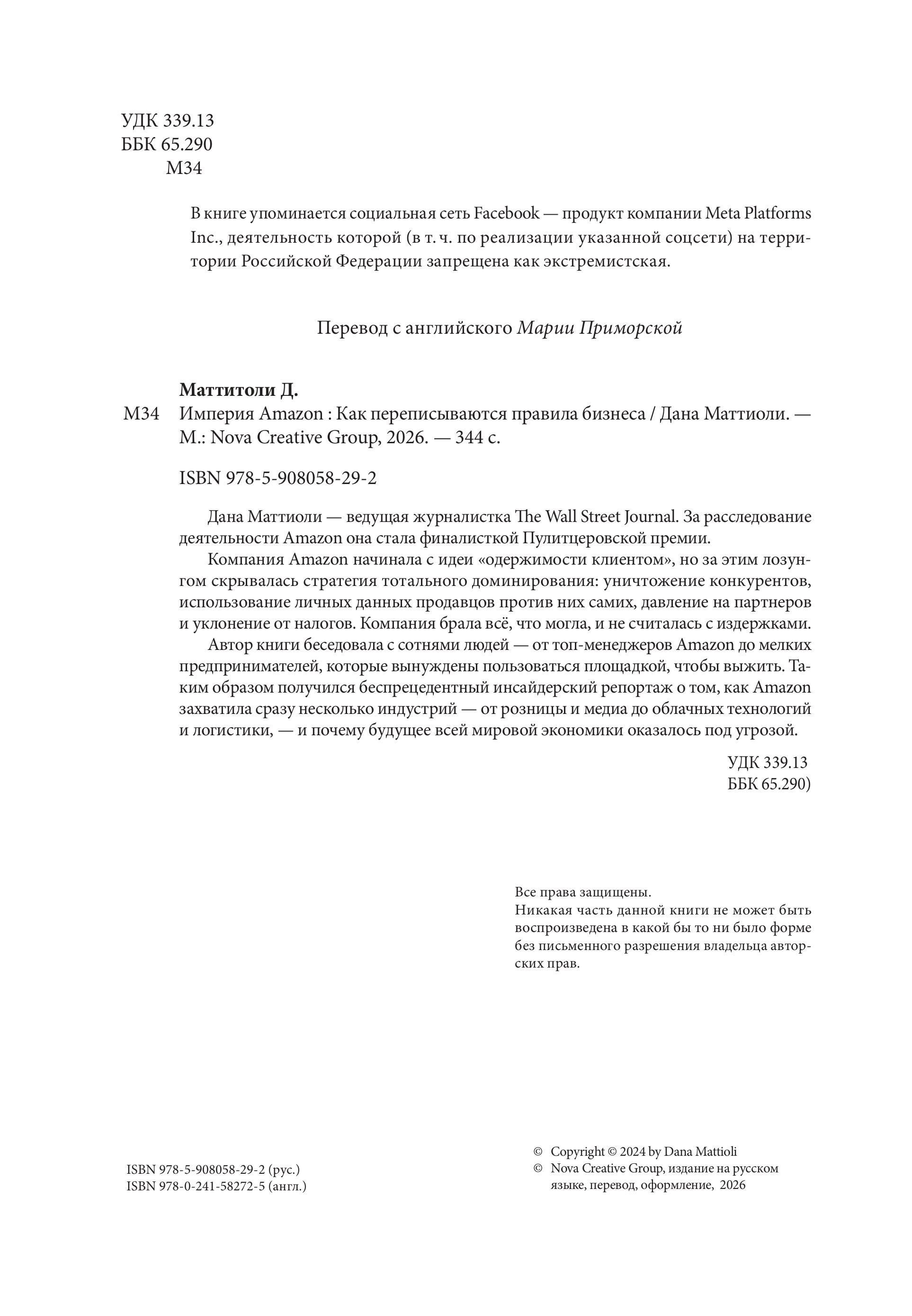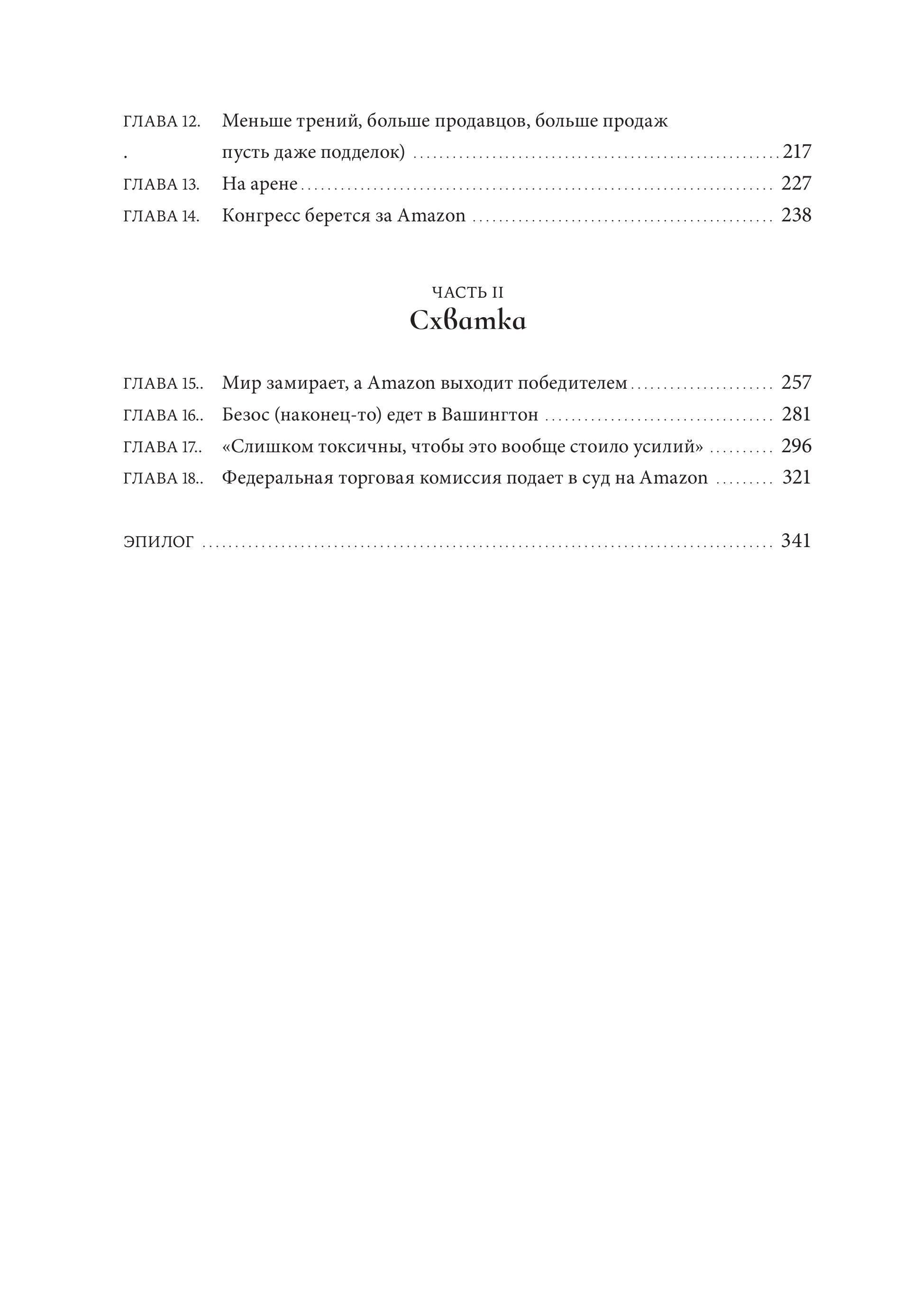 Компания Amazon начинала с идеи «одержимости клиентом», но за этим громким лозунгом скрывалась жесткая стратегия тотального доминирования: уничтожение конкурентов, использование личных данных продавцов против них самих, давление на партнеров и уклонение от налогов. Компания брала всё, что могла, и не считалась с издержками. Автор книги беседовала с сотнями людей — от топ-менеджеров Amazon до мелких предпринимателей, которые вынуждены пользоваться площадкой. Таким образом получился беспрецедентный инсайдерский репортаж о том, как Amazon захватила сразу несколько индустрий — от розницы и медиа до облачных технологий и логистики, — и почему будущее всей мировой экономики оказалось под угрозой