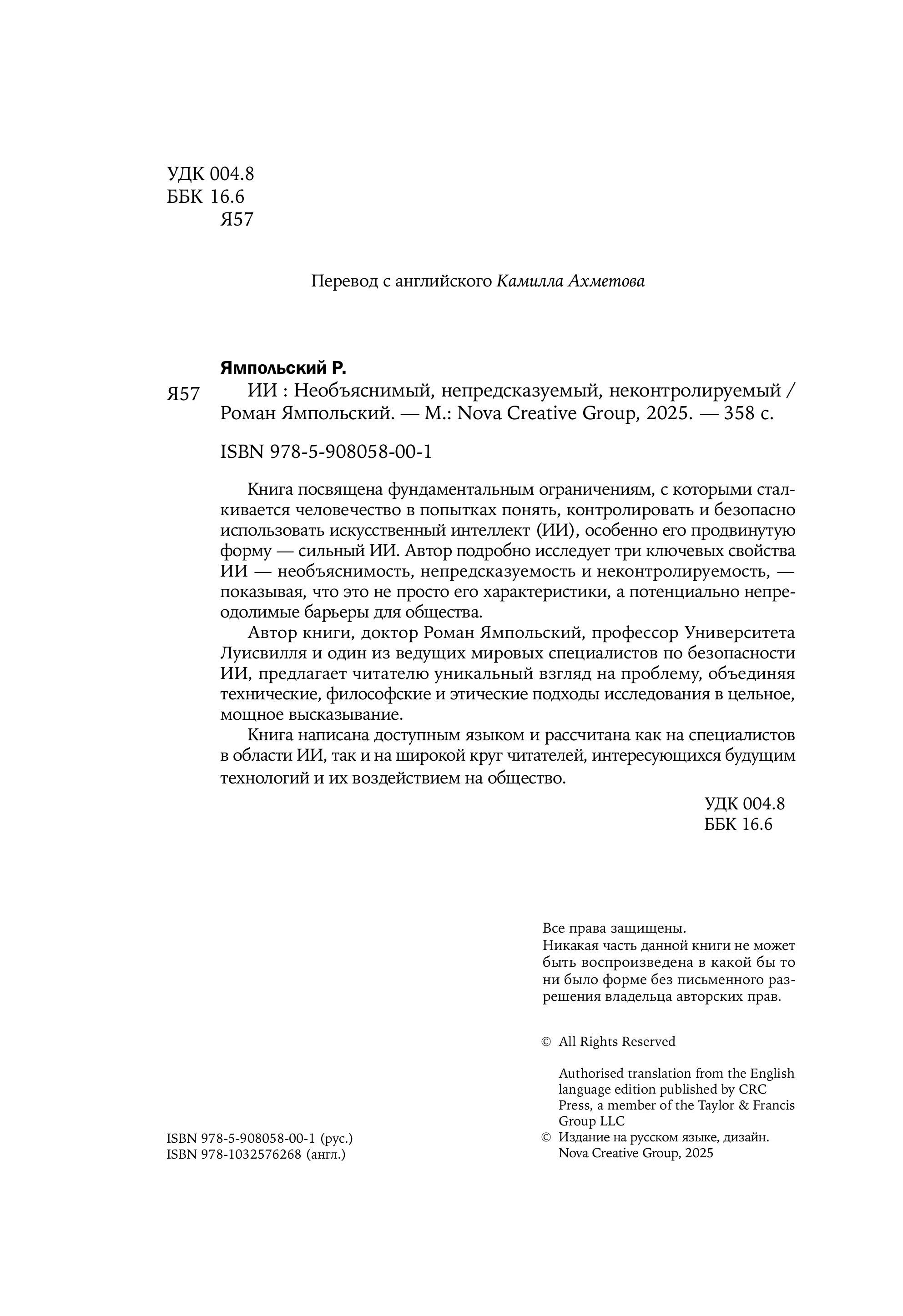Автор книги, доктор Роман Ямпольский, профессор Университета Луисвилля и один из ведущих мировых специалистов по безопасности ИИ, предлагает читателю уникальный взгляд на проблему, объединяя технические, философские и этические подходы исследования в цельное,мощное высказывание
