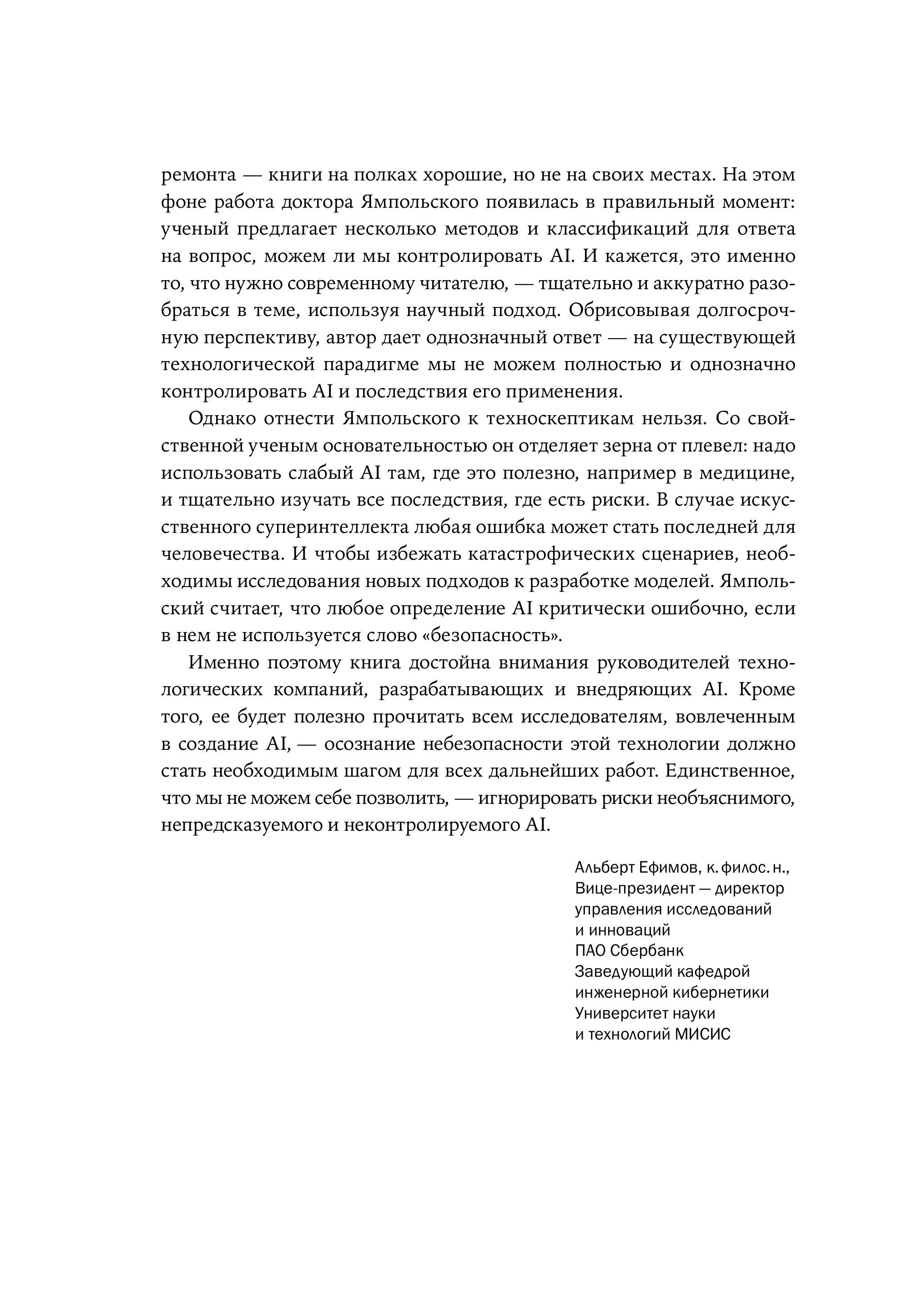«Чрезвычайно ценная книга Романа Ямпольского систематизирует обширные исследования, показывающие, что ИИ по своей природе непредсказуем и с высокой вероятностью может выйти из-под контроля. В книге подробно рассматриваются сценарии, способные привести к опасным последствиям, как до внедрения ИИ, так и после его развертывания. Это обязательное чтение для всех, кто интересуется безопасностью ИИ — а по причинам, изложенным в книге, это должно волновать каждого из нас».