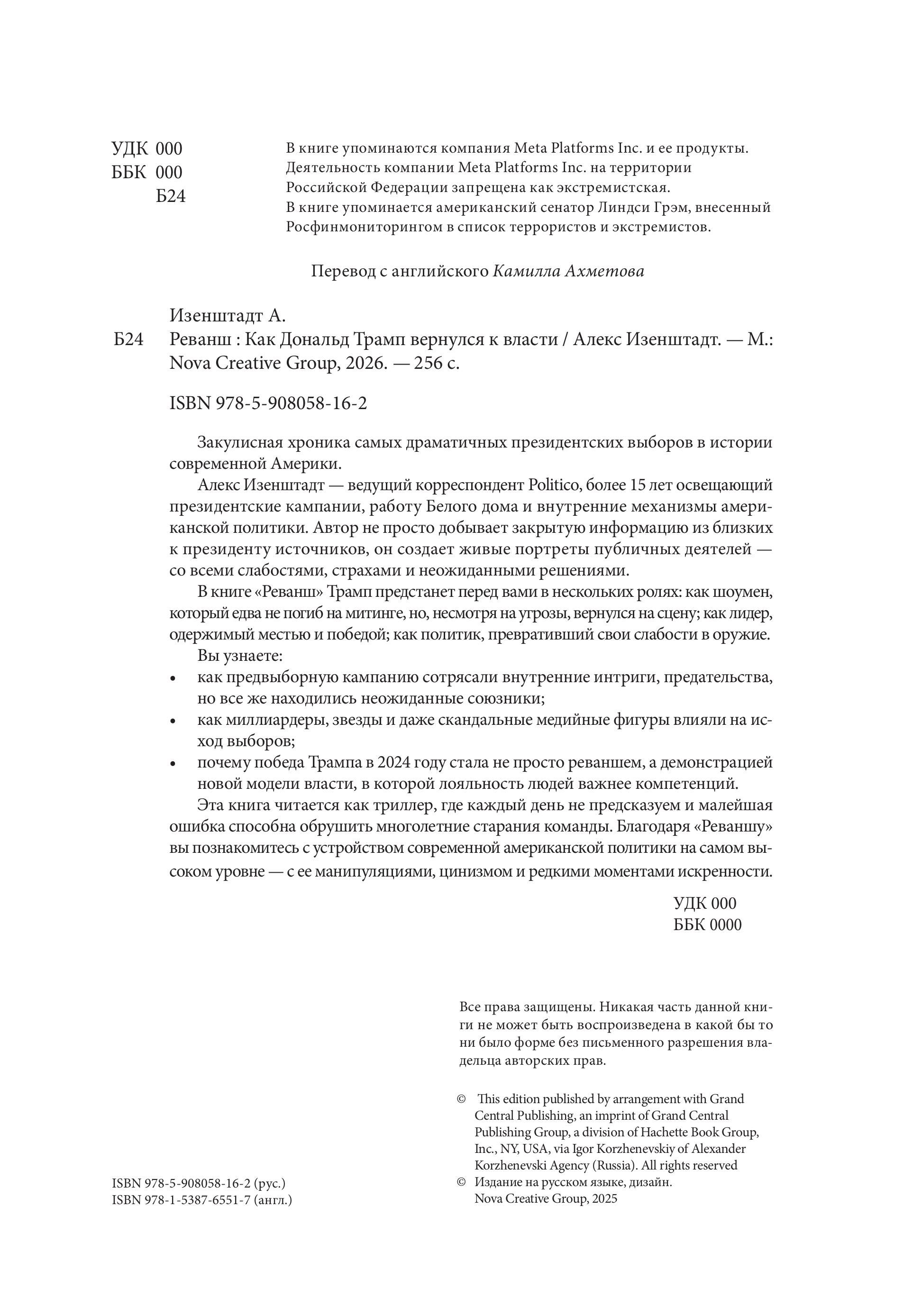 Эта книга читается как триллер, где каждый день не предсказуем и малейшая ошибка способна обрушить многолетние старания команды. Благодаря «Реваншу» вы познакомитесь с устройством современной американской политики на самом высоком уровне — с ее манипуляциями, цинизмом и редкими моментами искренности