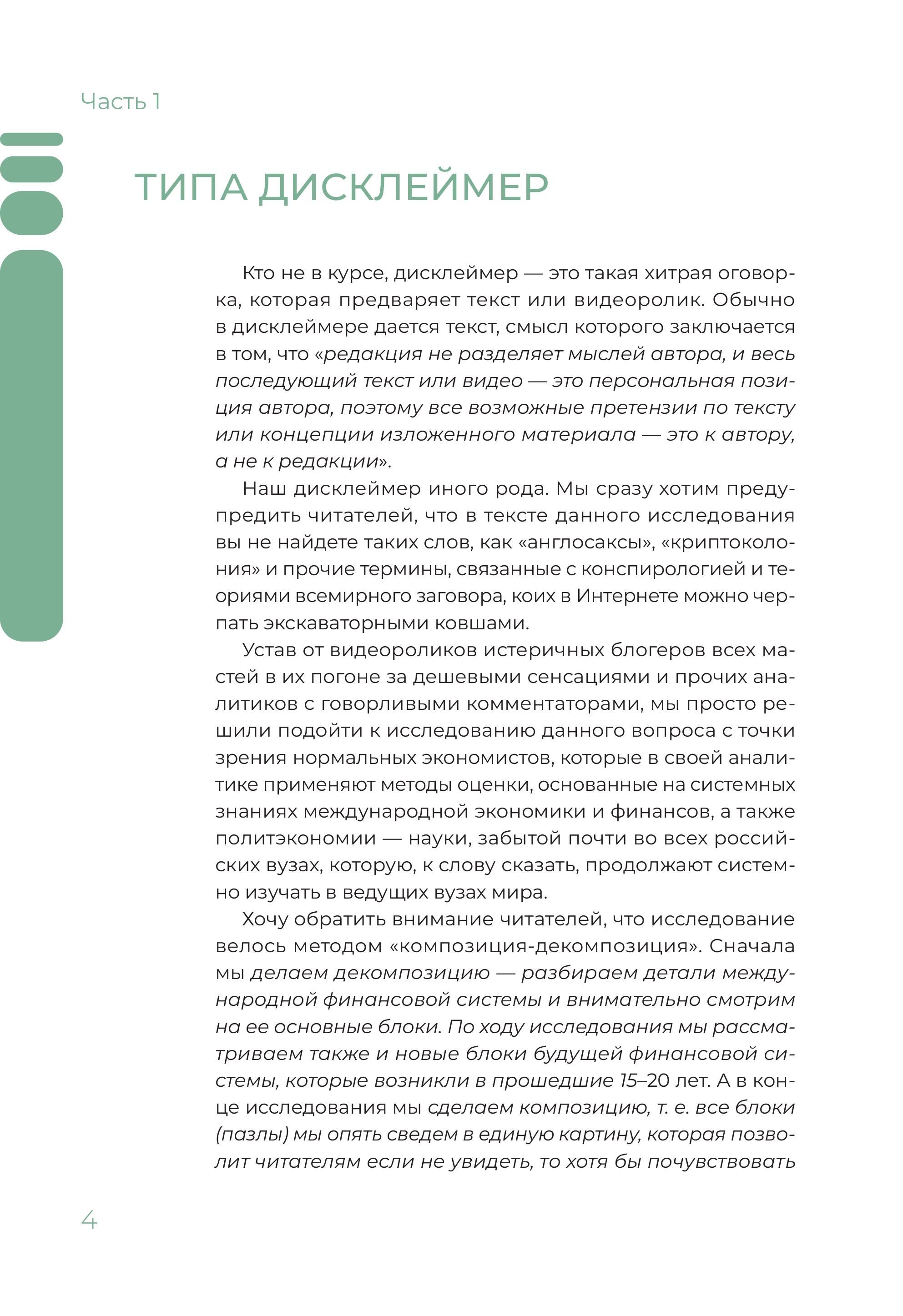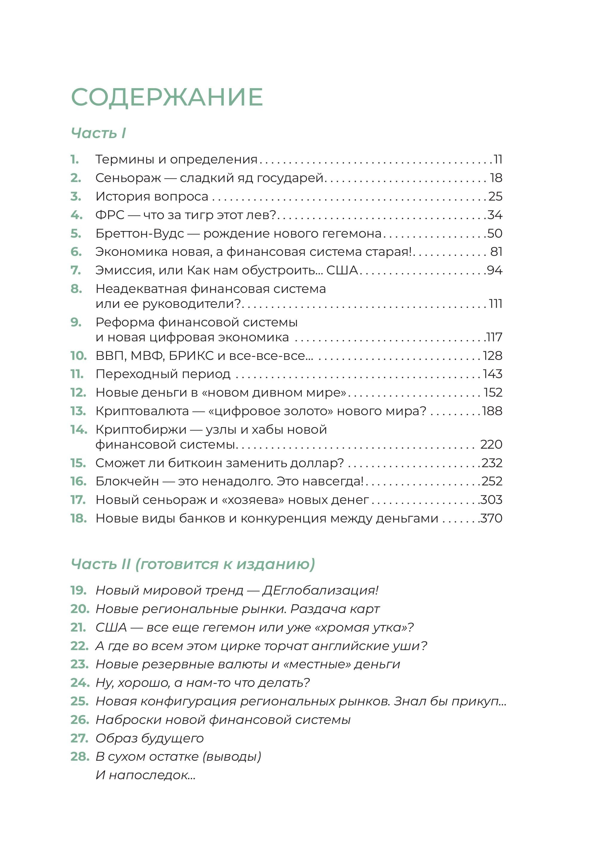Все говорят, что доллар США рухнет и международная финансовая система, основанная на нем, скоро падет. Однако никто не говорит, почему это произойдет и как это будет выглядеть — какие события будут сопровождать падение империи доллара. А самое главное — мало кто из серьезных экономистов пытается спрогнозировать, какой будет новая финансовая система в «новом дивном мире» и какие появятся новые резервные валюты и даже новые виды денег. Вот об этом рассказано в книге, и о многом другом, не менее интересном
